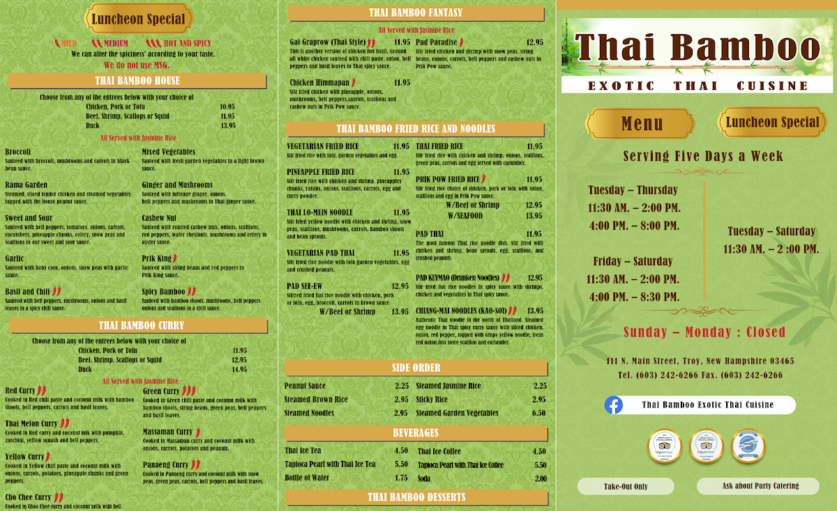Welcome to Thai Bamboo Exotic Thai Cuisine, a hidden gem located at 111 N Main St, Troy, NH. Although primarily known for their take-out service, this establishment creates an inviting atmosphere for those who choose to dine in. The owners are genuinely passionate about their craft, providing a warm welcome to every guest.